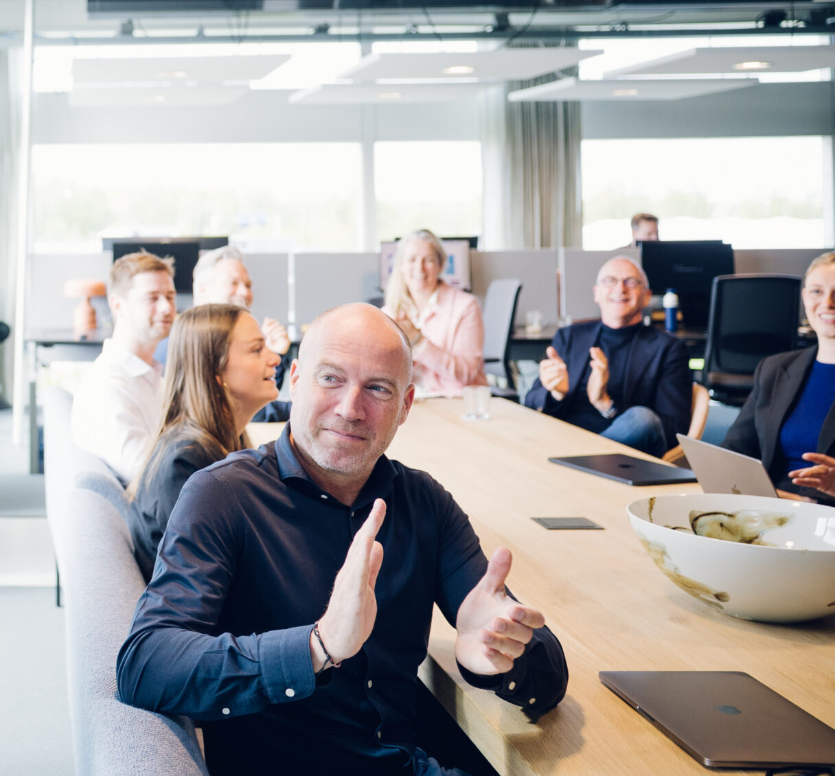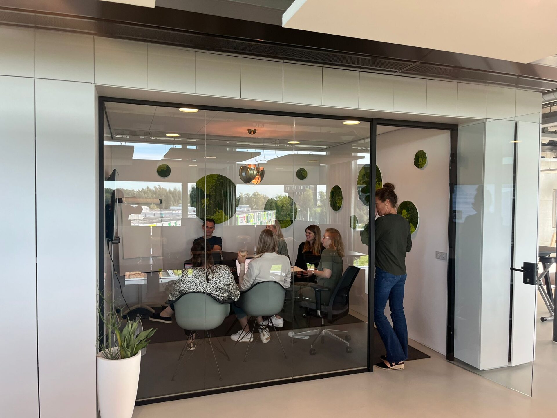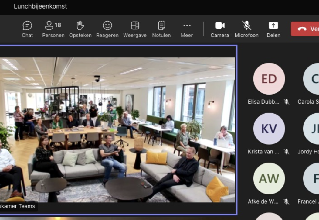 Met collega’s hebben we elke twee weken een (hybride) overleg om door te spreken wat de lopende acquisities zijn en hoe iedereen in het werk zit.